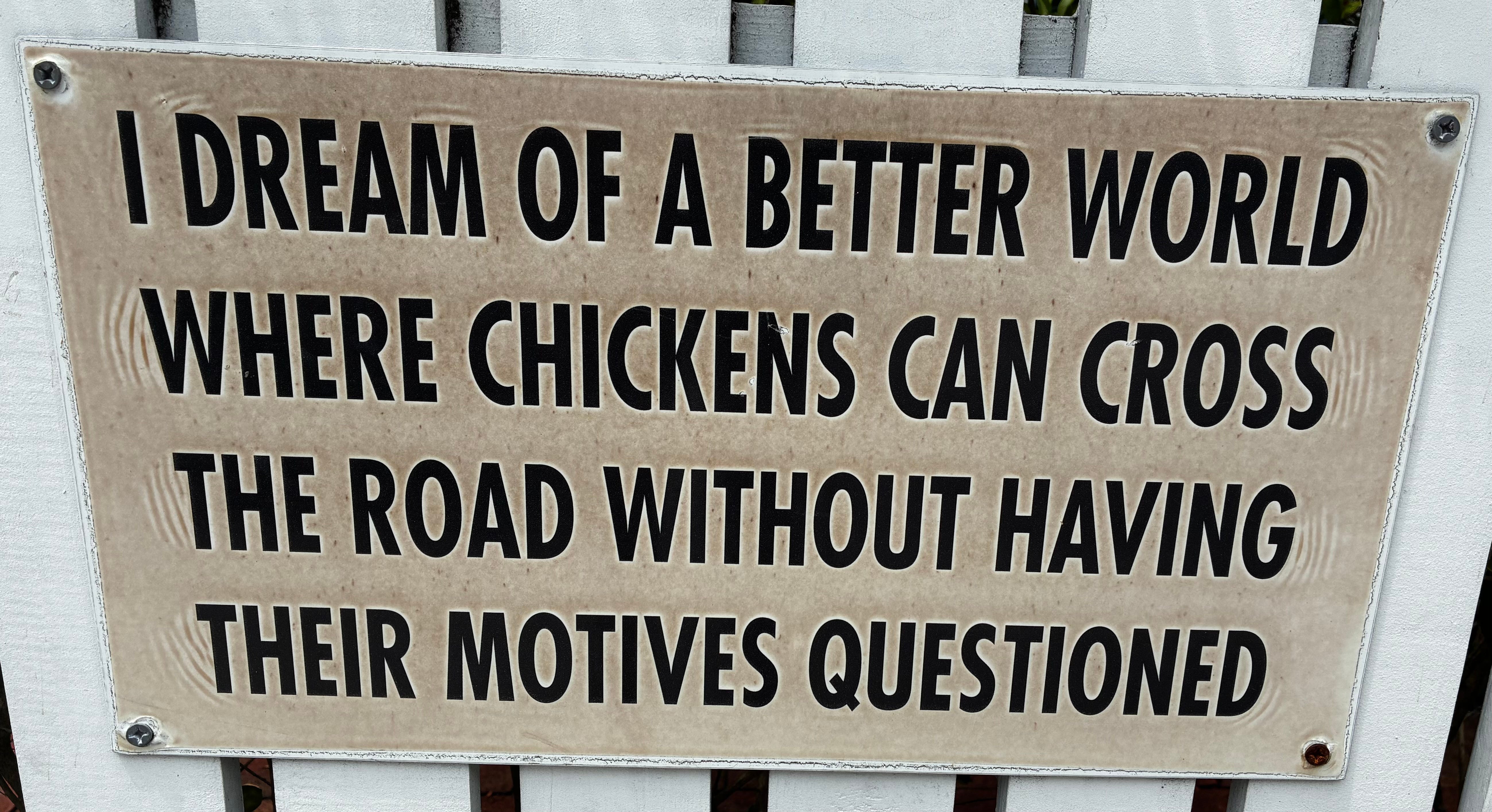 The forebears of Key West chickens were brought in during the late 1800s by Cuban immigrants who were big fans of cockfighting. But when cockfighting was outlawed in the 1970s, the roosters were let loose and left to do what roosters do. Which explains why there are an estimated 5,000 chicken roaming the streets of Key West these days, along with signs that wax philosophical.
